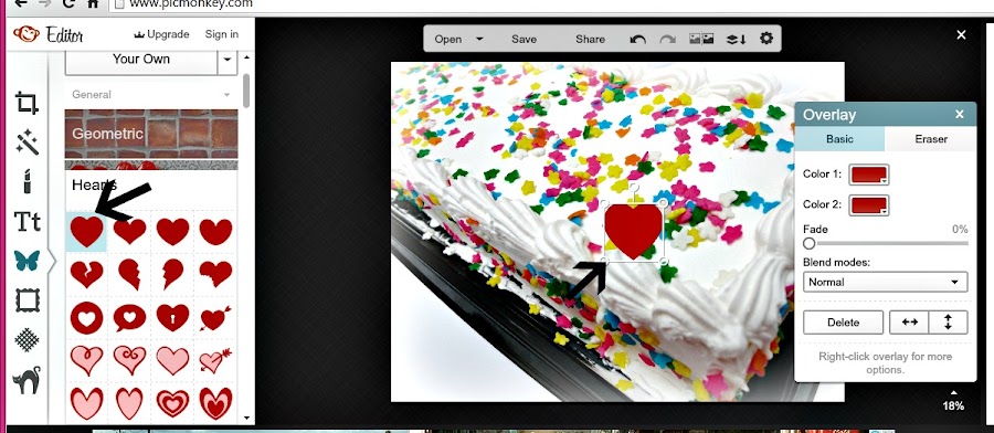 8. Vamos a hacer una prueba , pincha el botón de HEARTS corazones, se abre una ventana con varias opciones de corazón, escogemos la primera pinchando y aparece en el centro de la foto ¿ La ves ? hasta ahora todo es muy fácil y así seguirá :)