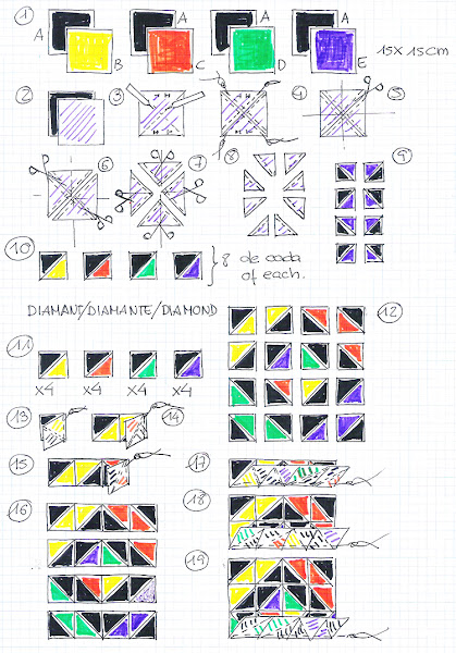 To the diamond block separate 4 squares with triangle of each pair (11) and the other half reserve it for another block. We distribute the parts (12); row to row, sew the pieces: the first with the second (13), the third with the previous two (14) and finish sewing the last (15). We have all (16) rows sewn, now we put them together: the first with the second (17), the third (18) and the fourth (19). Above all, is to ensure that the parts fit well, you dont want to run and taking the time that is needed. We have already finished the block. After ironing, trimming and polish, this is the result (20). We also wanted to show you an example of assembly (21), but this is a matter of personal taste.