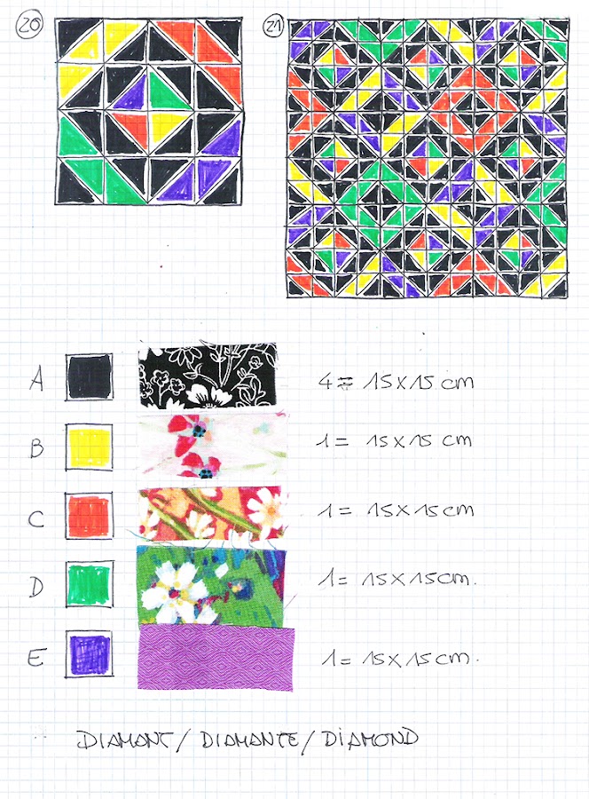 Pel bloc diamantseparem 4 quadrats amb triangle de cada parella (11) i l’altra meitat la reservem per un altre bloc. Distribuïm les peces (12); filera a filera, cosim les peces: la primera amb la segona (13), la tercera amb les dues anteriors (14) i acabem cosint l’última (15). Ja tenim totes les fileres cosides (16), ara toca unir-les: la primera amb la segona (17), la tercera (18) i la quarta (19). Sobretot, s’ha de procurar que les peces encaixin bé, no vulgueu córrer i preneu-vos el temps que calgui. Ja hem acabat el bloc. Després de planxar, quadrar i polir, aquest és el resultat (20). També hem volgut ensenyar-vos un exemple de muntatge (21), però això és ja una qüestió de gust personal.