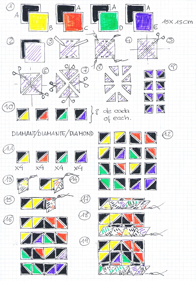 Empezaremos con el material. Necesitamos 8 retales de ropa de 15X15cm: 4 retales iguales (A) y 4 más, cada uno de ellos diferente (B, C, D, E). Ya sabéis que podéis variar la medida de la ropa a vuestras necesidades. Emparejaremos cada retal A con el resto de retales (1). Con cada pareja seguiremos los siguientes pasos: encararemos los cuadrados (2); con un lápiz o marcador dibujaremos en el reverso de uno de los cuadrados dos diagonales (3); coseremos, siguiendo las diagonales, una costura a cada lado de las mismas tal como veis en el esquema (4); recortaremos entre las costuras (5 y 6) hasta obtener 4 triángulos; estos triángulos los cortaremos por la mitad (7) y hemos de acabar teniendo 8 triángulos iguales (8). Cuando abrimos hemos obtenido 8 cuadrados con triangulo (9), es decir, 8 cuadrados de cada pareja (10). Ya hemos hecho todas las piezas que necesitamos para los dos bloques.