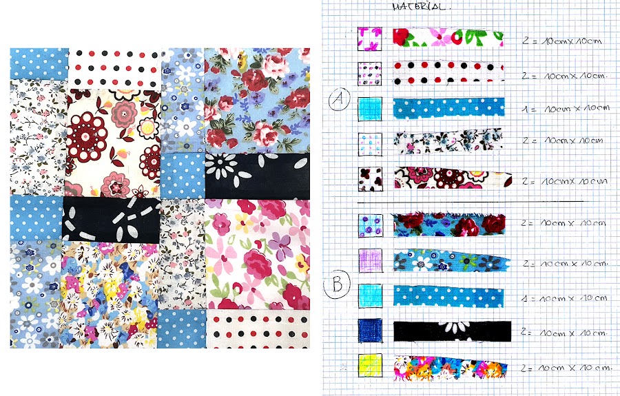 To start the tutorial, the first thing we will do will be to remember how to make the magic 9. So, for what we have planned, we need two blocks of 9, so well give you the material and differentiate the blocksin A and B. As you can see, well use 18 10cmX10cm squares: 9 for A and 9 for B (1); the common element is the central square that is the same in the two blocks. Here we leave you a sample with the measurements and quantities of the two blocks, which will serve you as a small guide to follow the tutorial.