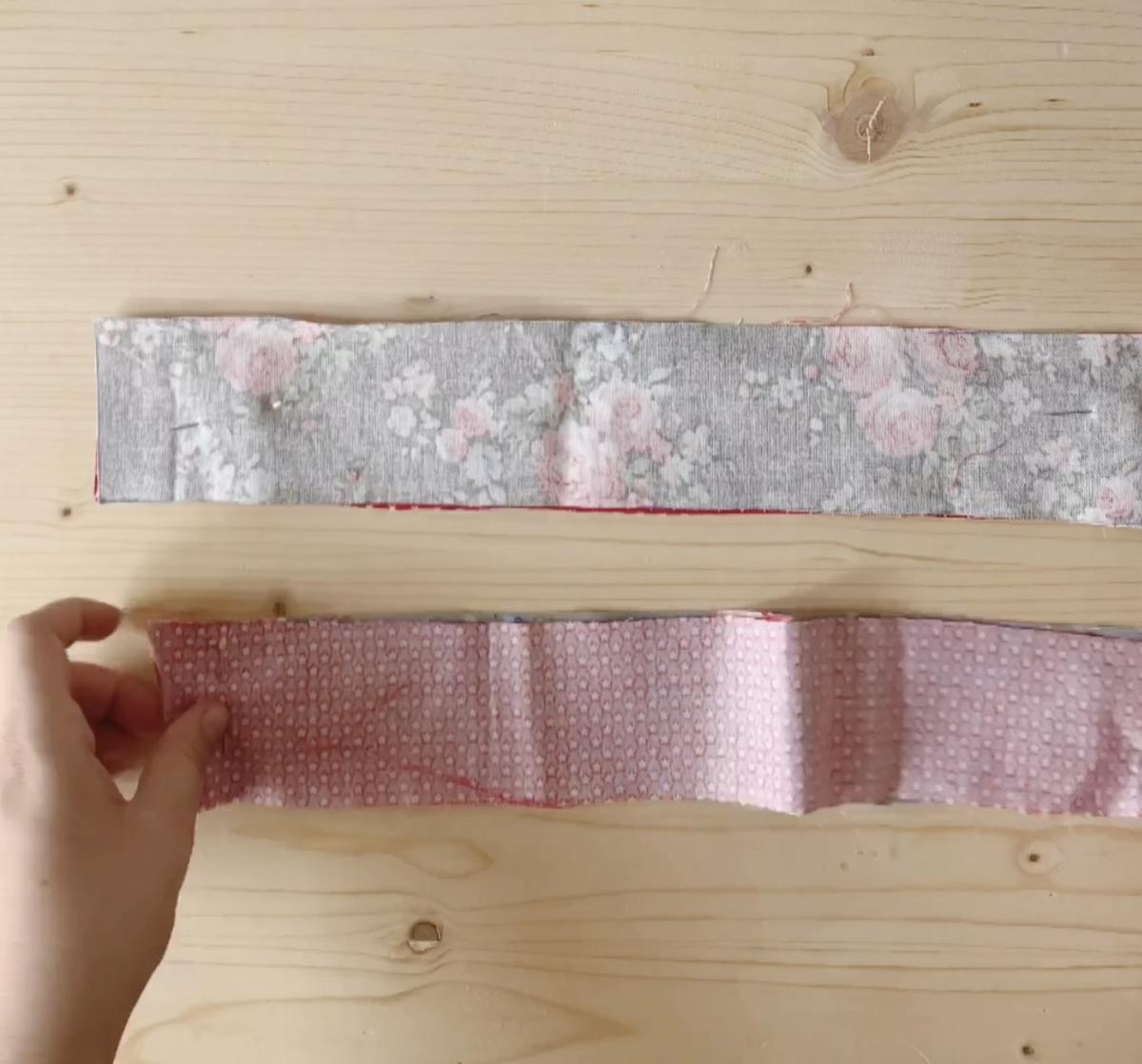 Empezaremos por las asas. Enfrentamos la parte bonita de cada una de ellas, sujetamos con agujas y cosemos en forma de U dejando uno de los extremos cortos sin coser. Una vez cosidos, les damos la vuelta por el agujero que hemos dejado sin coser y planchamos.