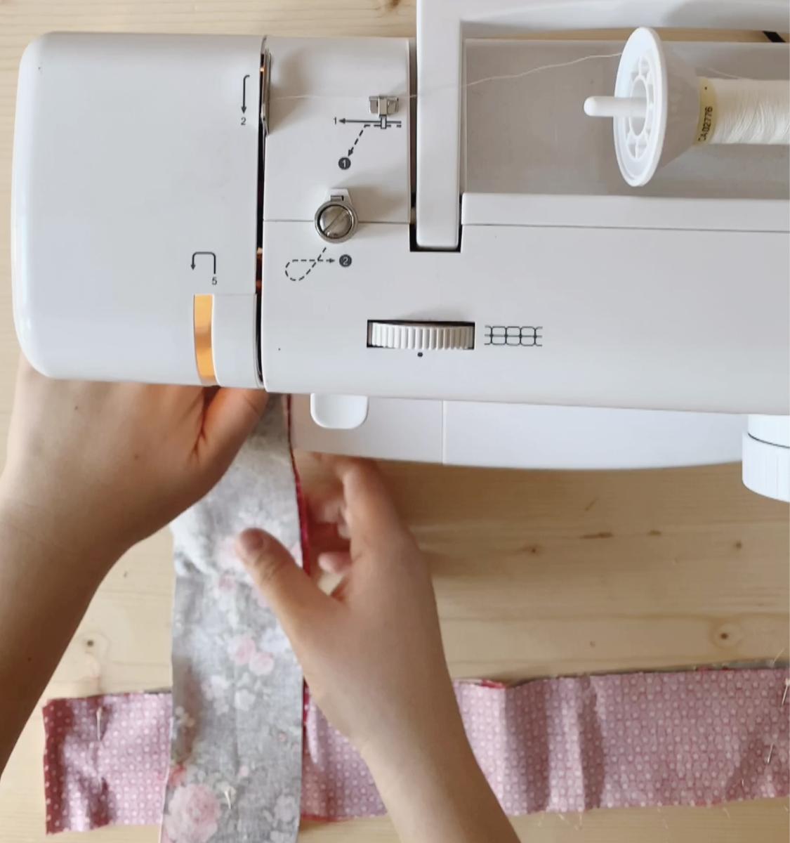 Presentamos las asas en la tela de la luneta (o en la exterior que hayamos escogido). Con ayuda de un metro calculamos para que las asas nos queden centradas e igualadas en ambos costados. Después ponemos por encima la tela de algodón (la del interior), del revés. Es decir, que las partes bonitas de las telas queden enfrentadas. Lo sujetamos con agujas y cosemos todo el contorno a 1cm dejando un agujero sin coser de unos 10cm.