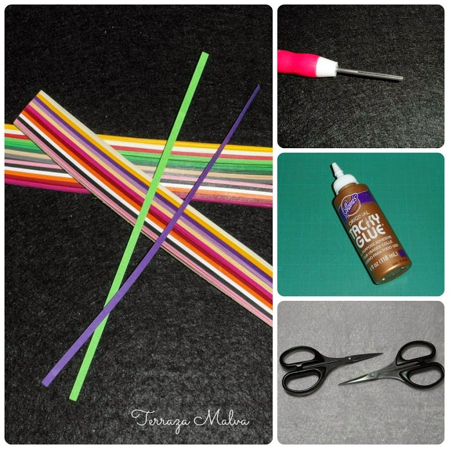 Tiras de papel fino de colores en anchos que pueden ir desde unos 3 milímetros hasta 1 centímetro o más. También pueden utilizarse tiras de papel grueso e incluso cartulina, aunque cuanto mayor sea el grosor del material mayor será la dificultad para trabajarlo o lograr ciertas formas. El papel puede comprarse precortado o cortarlo uno mismo al ancho deseado.