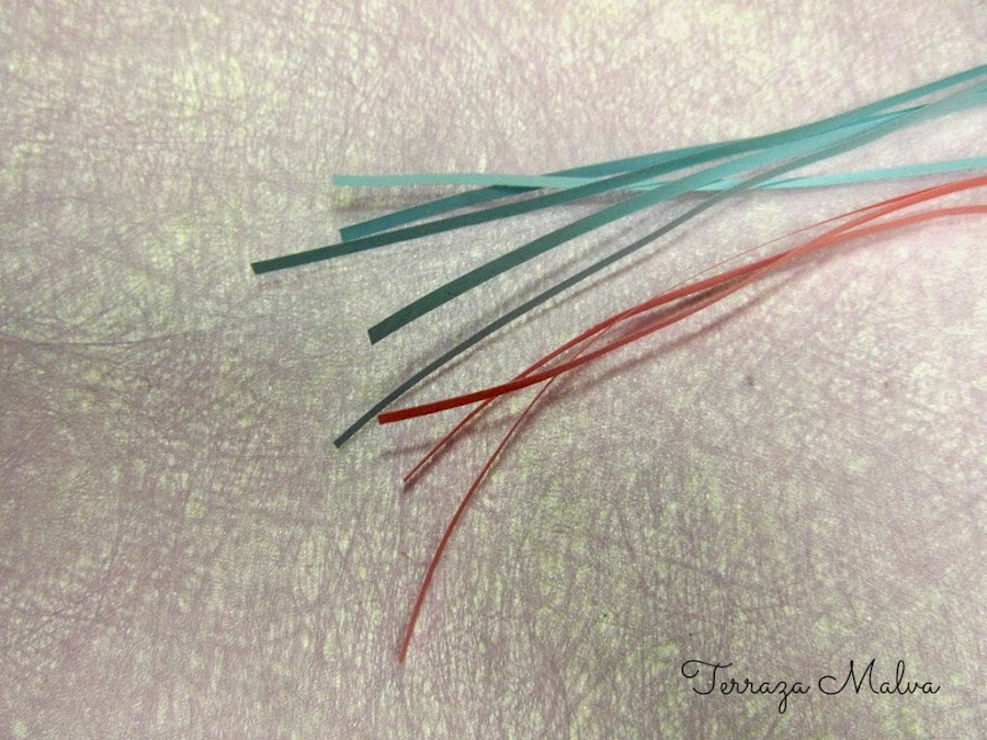 Para lograr una forma enrollada apretada con efecto de espiral se ha de partir de varias tiras de papel de al menos dos colores diferentes. En el ejemplo de las fotos inferiores he utilizado cinco tiras de color azul y tres tiras de papel de color rosa.