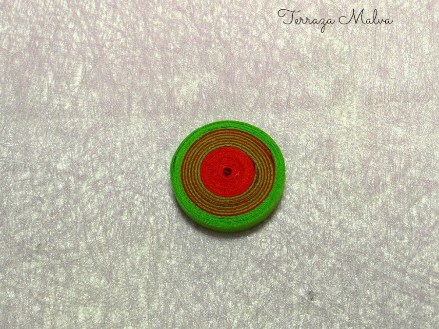 Por último añadir que se pueden combinar los tipos de enrollado apretado, como en la figura obtenida en la imagen inferior, en la que se ha combinado un círculo apretado rojo, para continuar con una espiral en rojo y verde y para finalizar un nuevo círculo apretado de color verde.