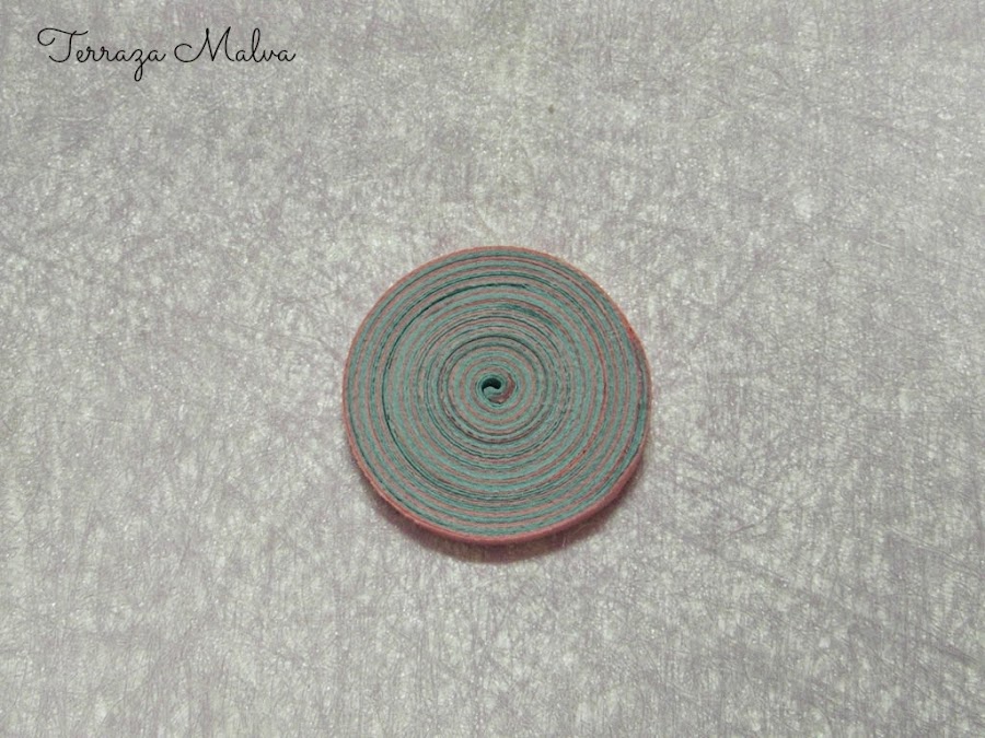 La espiral queda terminada. Si se quiere obtener un diámetro mayor se habrán de utilizar inicialmente tiras de papel unidas de la longitud deseada. Sino, si se intentan añadir otras una vez terminadas de enrollar las primeras, no quedaría bien continuar con otro nuevo grupo de tiras y se rompería el efecto de espiral.