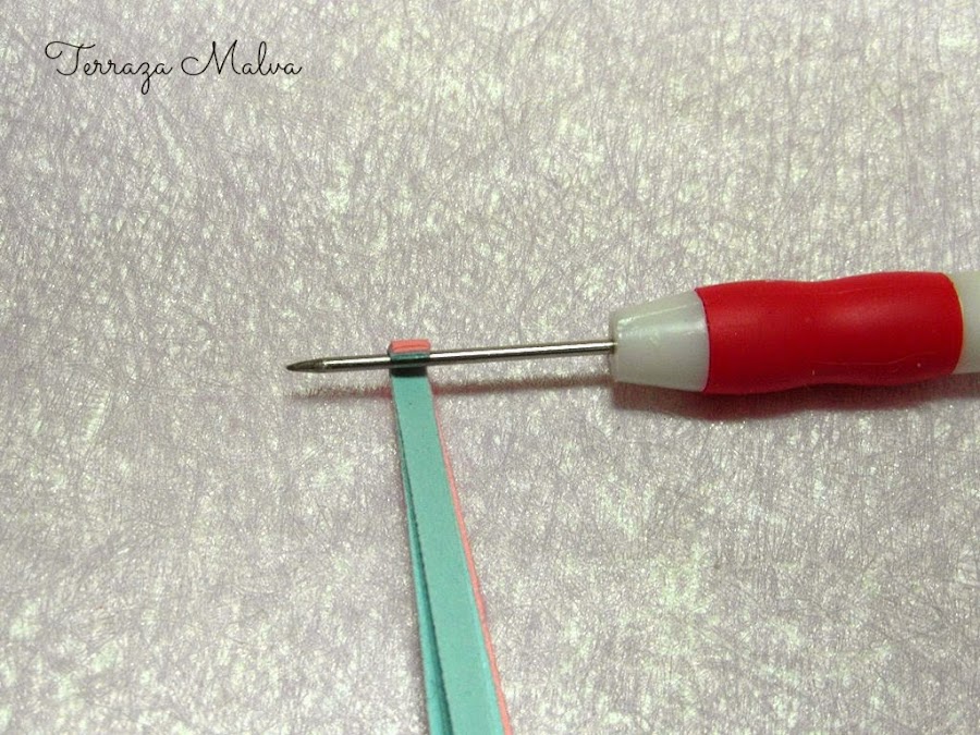 En este caso se utilizará una herramienta de tipo aguja o punzón, pues el conjunto de todas las tiras es demasiado grueso como para insertarlo en la ranura de una herramienta de enrollado como la que utilicé en el principio del tutorial. Con los dedos se amolda el inicio de las tiras alrededor de la aguja y se van enrollando sobre si mismas de forma apretada.