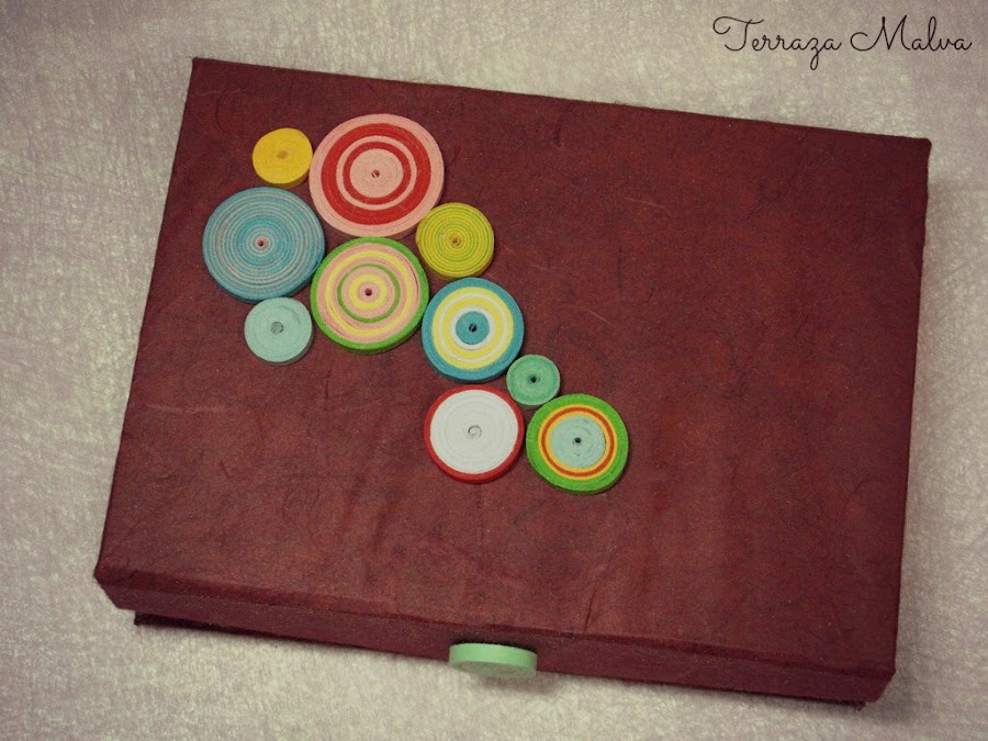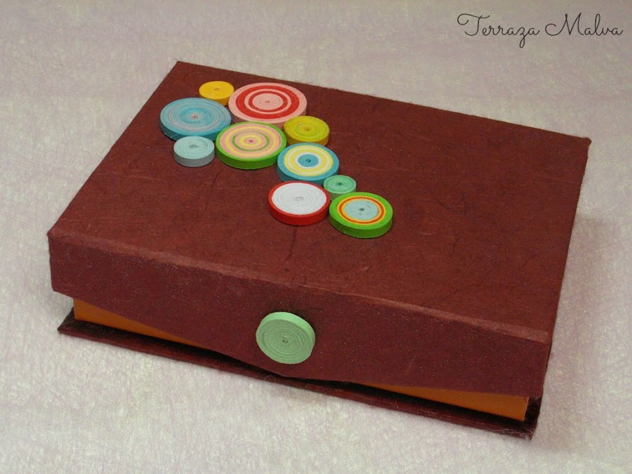 Aquí he utilizado unos cuantos enrollados apretados para adornar una caja forrada con papel de arroz granate.