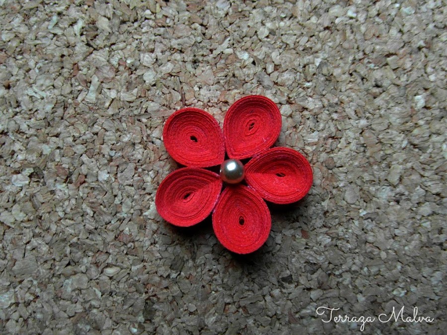 Para el caliz también pueden usarse pequeñas cuentas o botones. En la foto inferior podéis ver una flor en la que he usado una cuenta tipo perla.