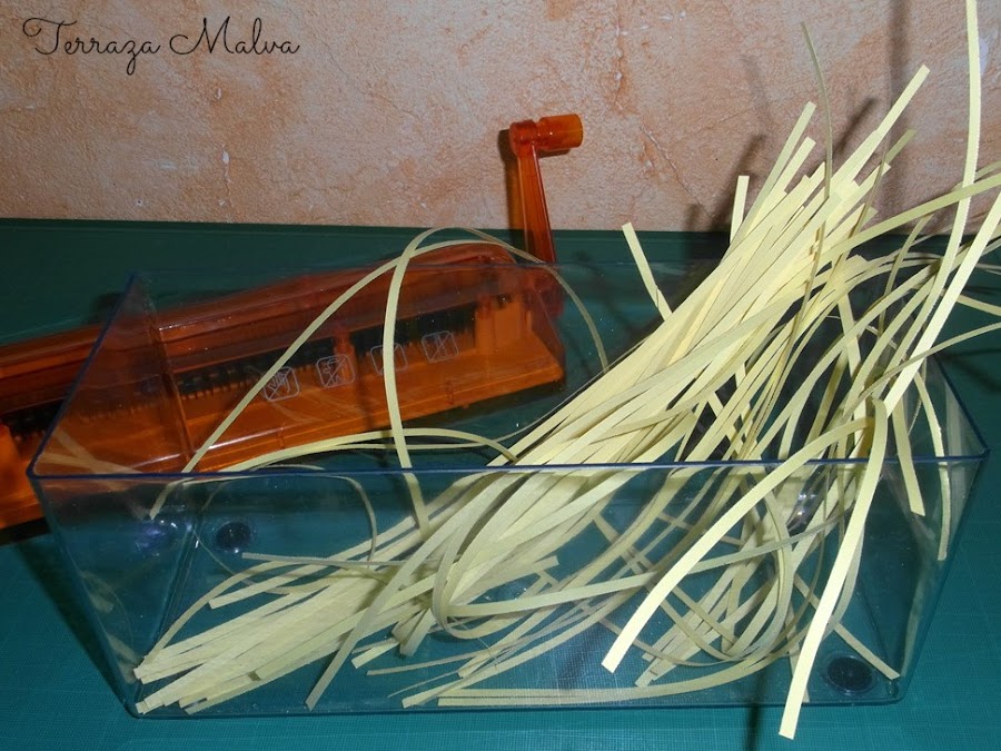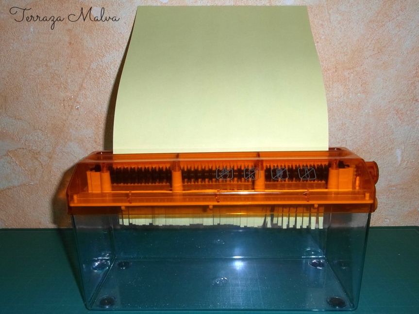 Otro método para obtener tiras consiste en utilizar una destructora de papel. De esta manera las tiras que se obtienen son todas del mismo tamaño, no hay que hacer marcas en el papel y el proceso es mucho más rápido y cómodo.