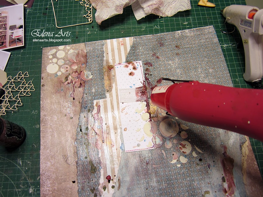 Seguimos creando la textura, añadimos más capas como pueden ser el papel sobrante de los elementos troquelados o unos tags... Podemos hacer un embossing que siempre queda muy bonito.
