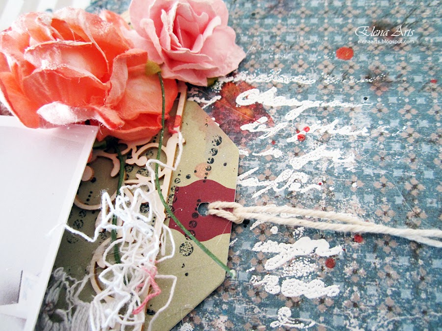 Así, pues, añadimos flores, cintas de encaje, chipboards, botones, sellos, etc. Y para terminar salpicamos por encima con la pintura y ya está, nuestro layout está listo!