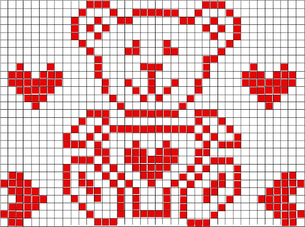 Hacemos 21 vueltas de punto liso, sin aumentos ni disminuciones y en la 22 empezamos el dibujo delantero del "Osito con corazones" seguiremos el gráfico con la misma anchura hasta la vuelta 56, donde empezaremos a menguar las sisas.