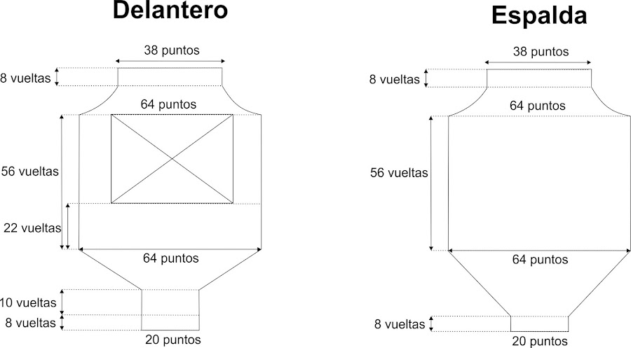 La pieza trasera de nuestro peto de punto se teje igual que la pieza delantera, aunque con algunas diferencias