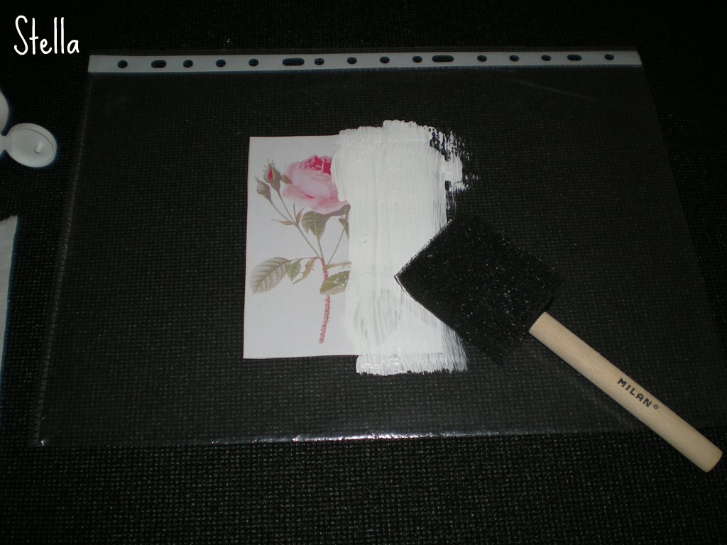 2-Colocaremos cantidad generosa sobre la fotocopia y extenderemos ayudadas por un aplicador,puede ser pincel o esponja como veís...