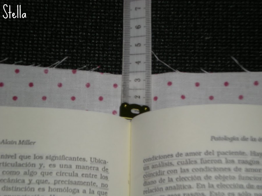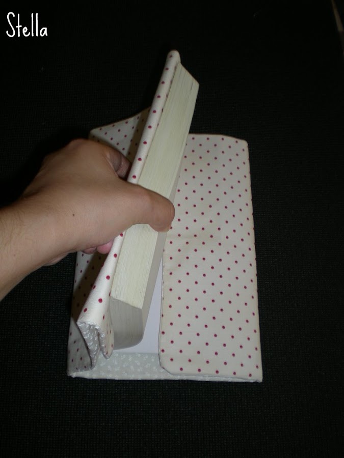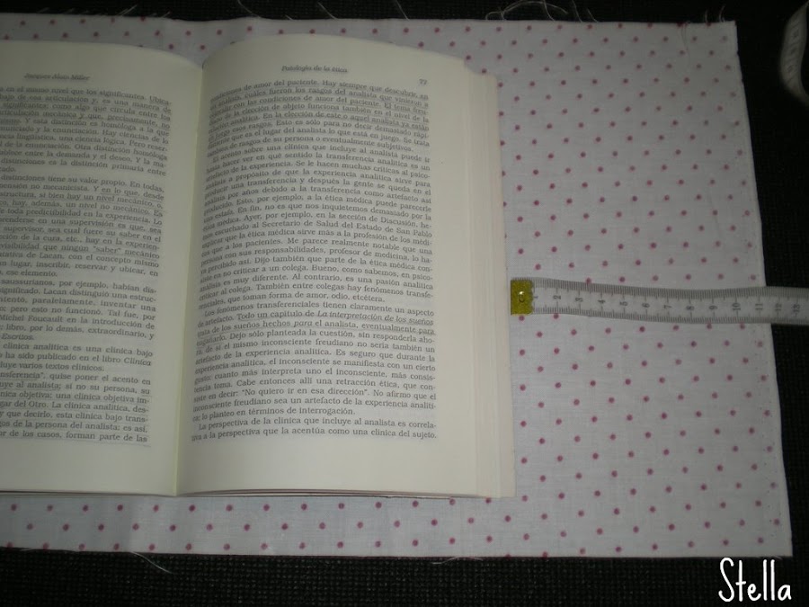 7-Poner el libro en medio de la tela para ajustar las medidas y hacer el doblez de 10 cm de cada lado así: