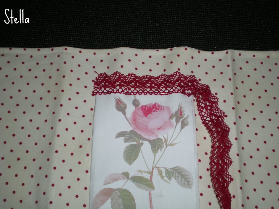Una vez hemos cosido la decoración,ya podemos coser los márgenes de los costados hacia adentro,y rematar con un pespunte por todos los bordes de la funda.