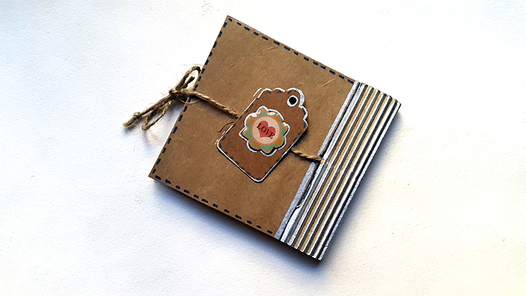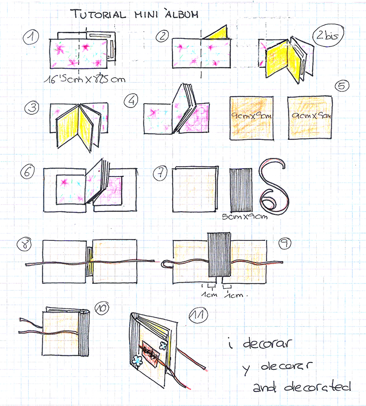 To make the binding we have used two recycled cardboard of 9cmX9cm (5). Leaving a space between the cardboard, with double-sided methods attach the sheets of our mini album focusing them (6). We can only finish the binding by adding the back of 5cmX9cm and the cord to lock it (7). First place the cord, focused (8); engage the back in 1 cm of each cover (9), because it is one sufficient space to well open the mini album. We ended up doing the decoration of the cover and the back cover the more we like it. And just decorate the pages; we have chosen to draw doodles with fine tip black marker.