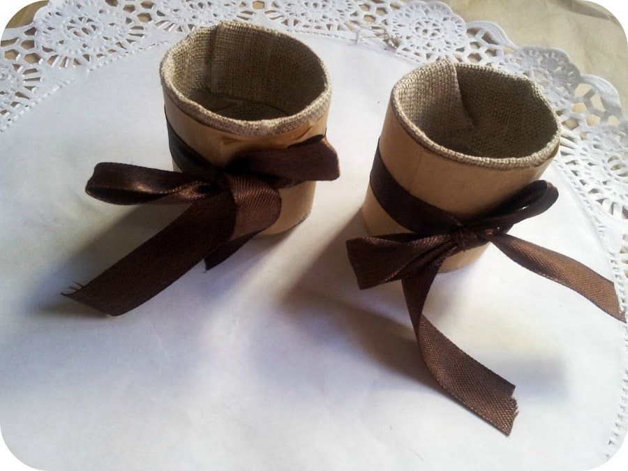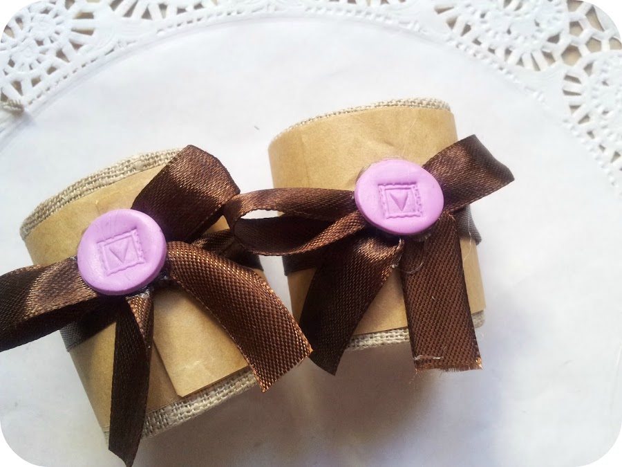 Vamos a adornalos con unos lazos a juego, yo los he escogido marrones. Hacemos una lazada con la pistola de silicona le echamos una gotita para que no se deshagan y no se muevan de su sitio. Cortamos el sobrante de los extremos si han quedado muy largos y le pasamos un segundo la llama de un mechero para que no se deshilachen.