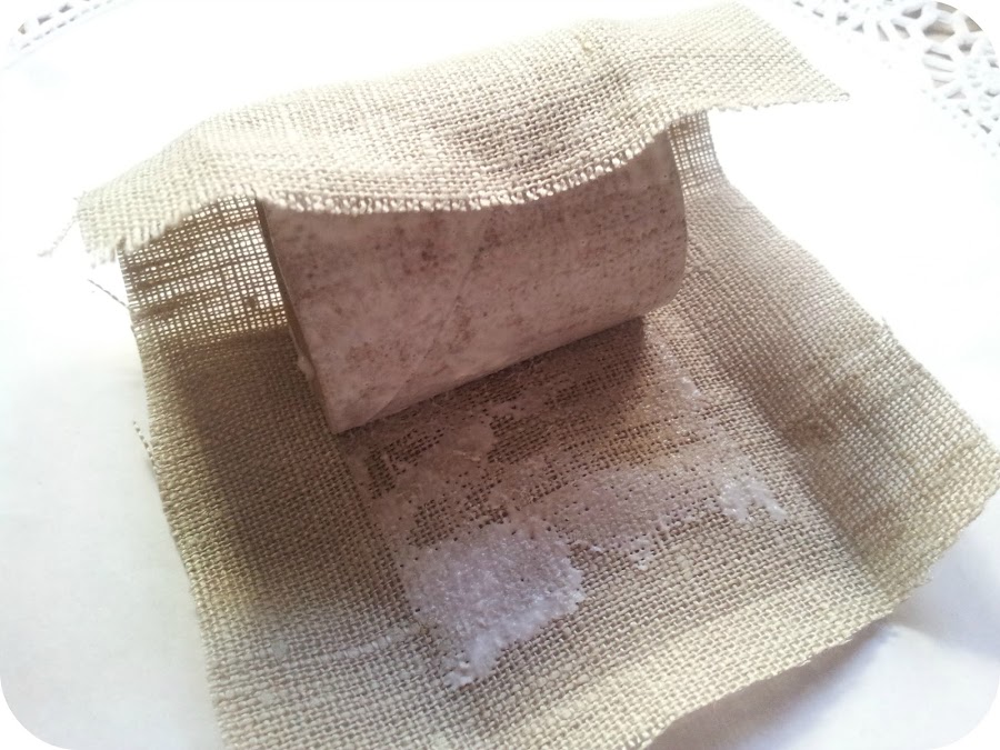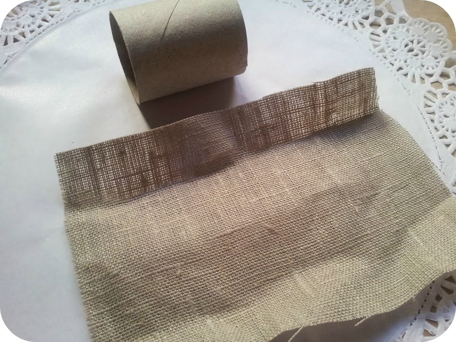 Vamos a cortar el rollo de papel higiénico por la mitad. Vamos a untar las dos mitades con cola blanca y las vamos a forrar con tela de arpillera o lino.