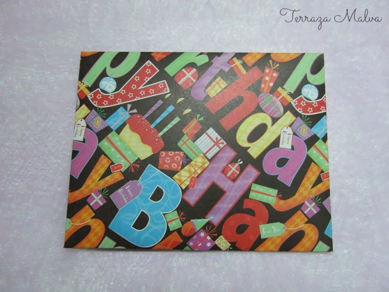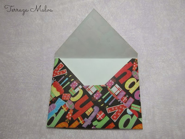 Siguiendo la misma técnica he realizado un sobre para una tarjeta de cumpleaños con un papel muy colorido, pero esta vez decorado sólo por una de sus caras (en este caso hubiera sido excesiva una decoración interna del sobre...).