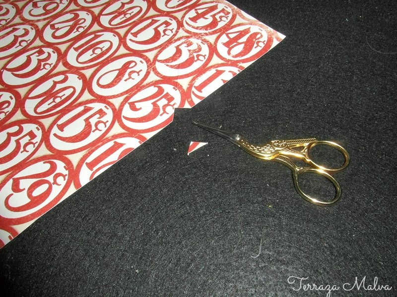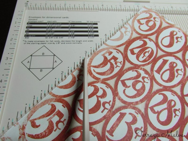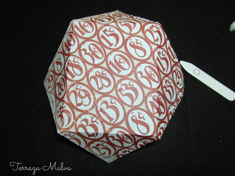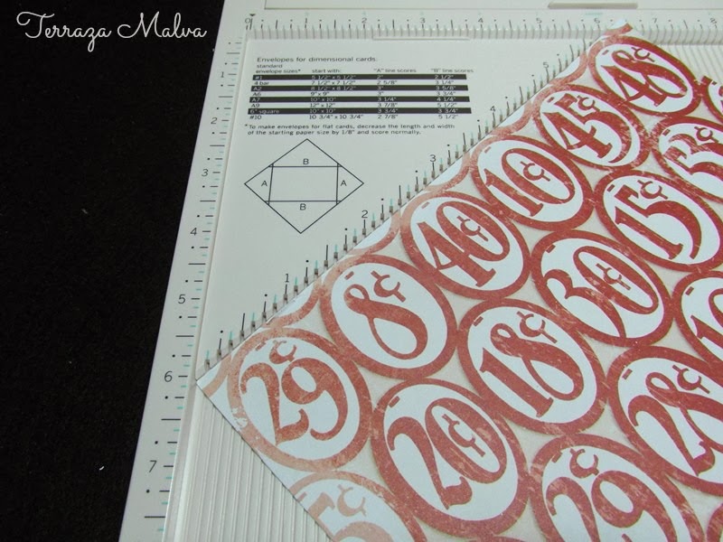 El papel está decorado por ambas caras. Por el exterior voy a utilizar la cara con números en rojo.