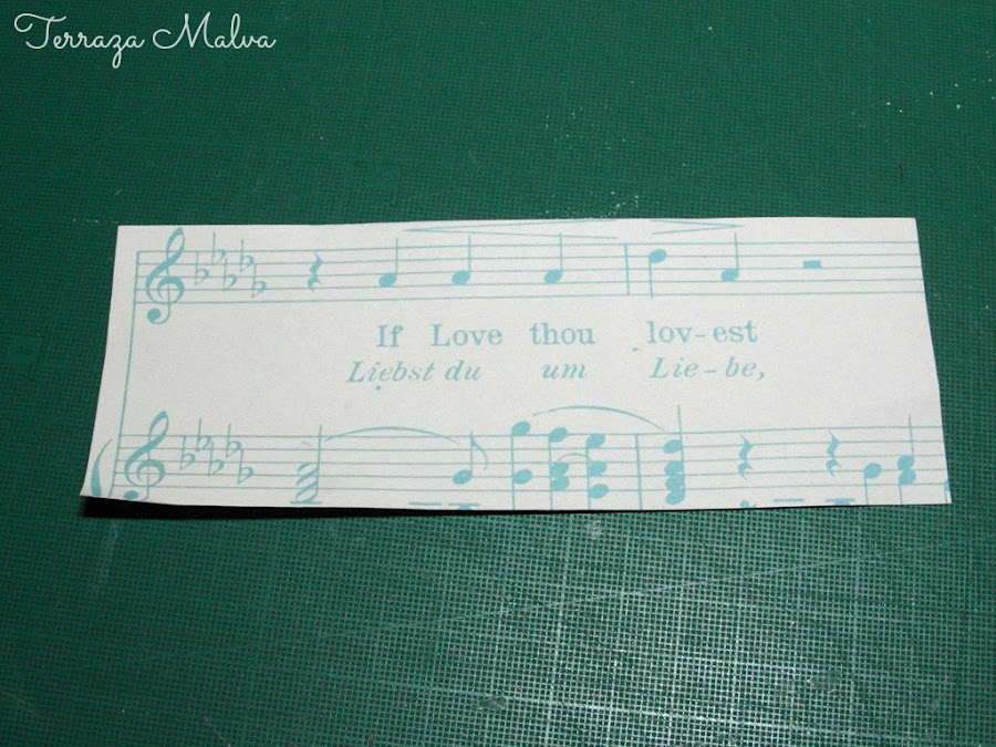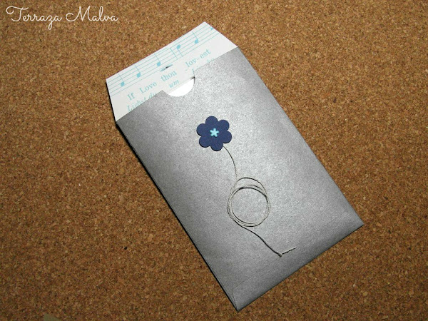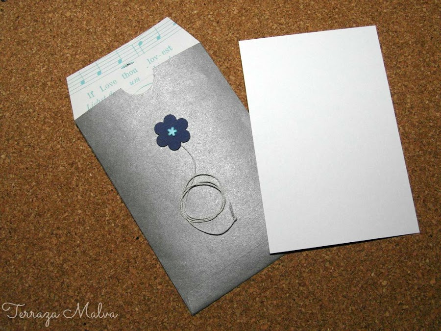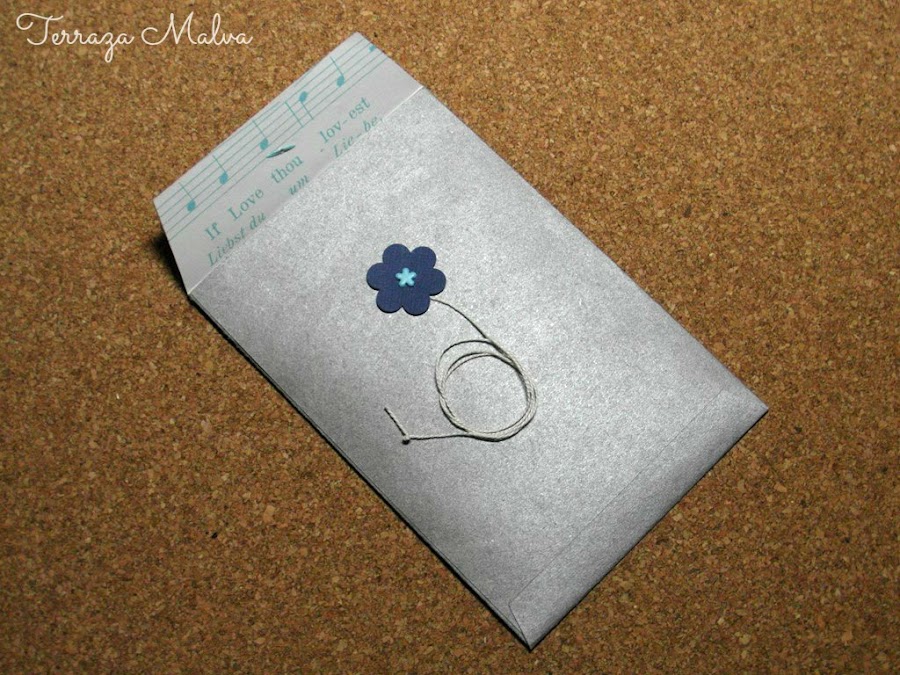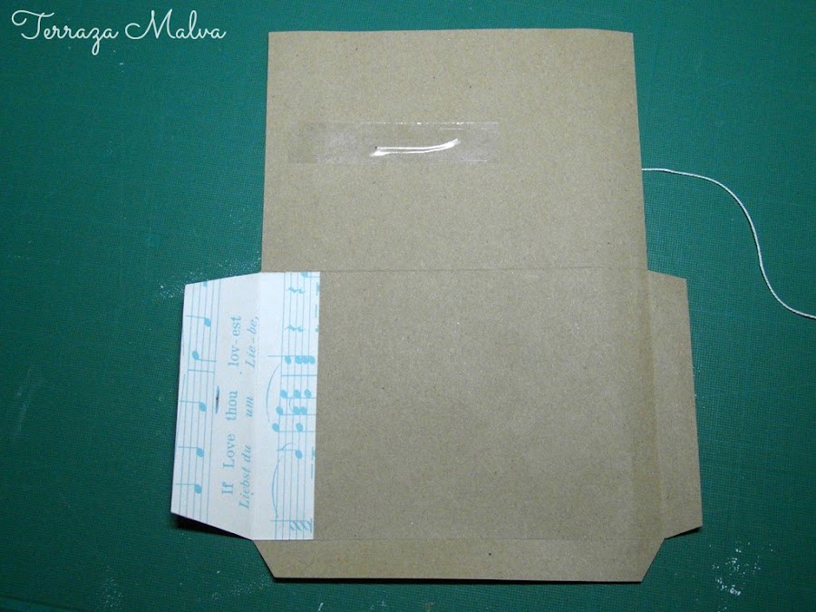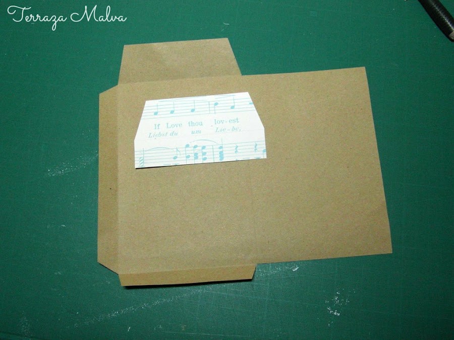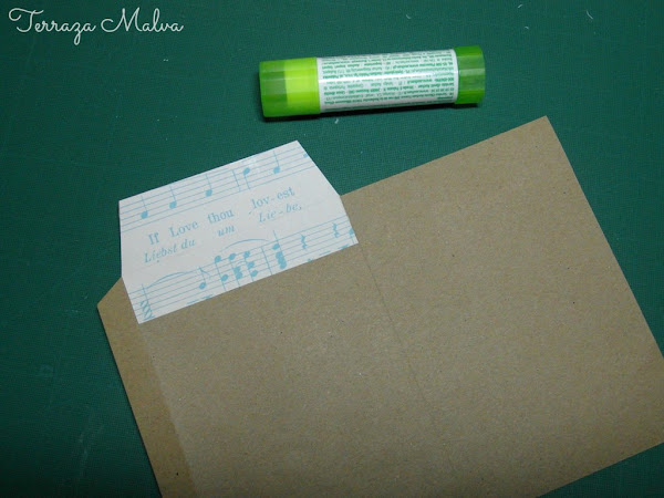 Como el papel de la bolsa que he reciclado era bastante grande he aprovechado para hacer otro sobre y mostraros otra terminación más elaborada. Para ello he usado un retal de papel de scrapbooking de temática musical.