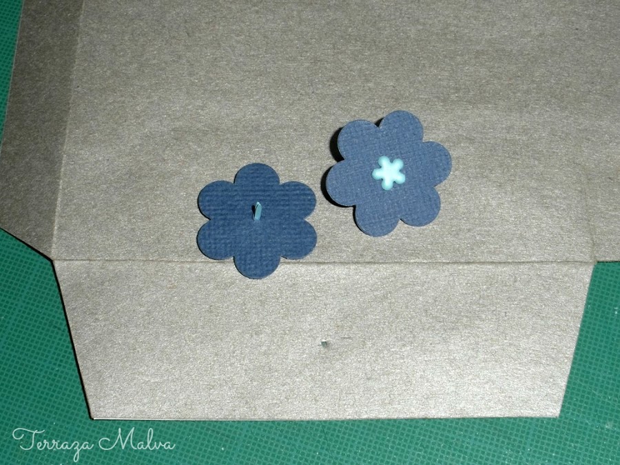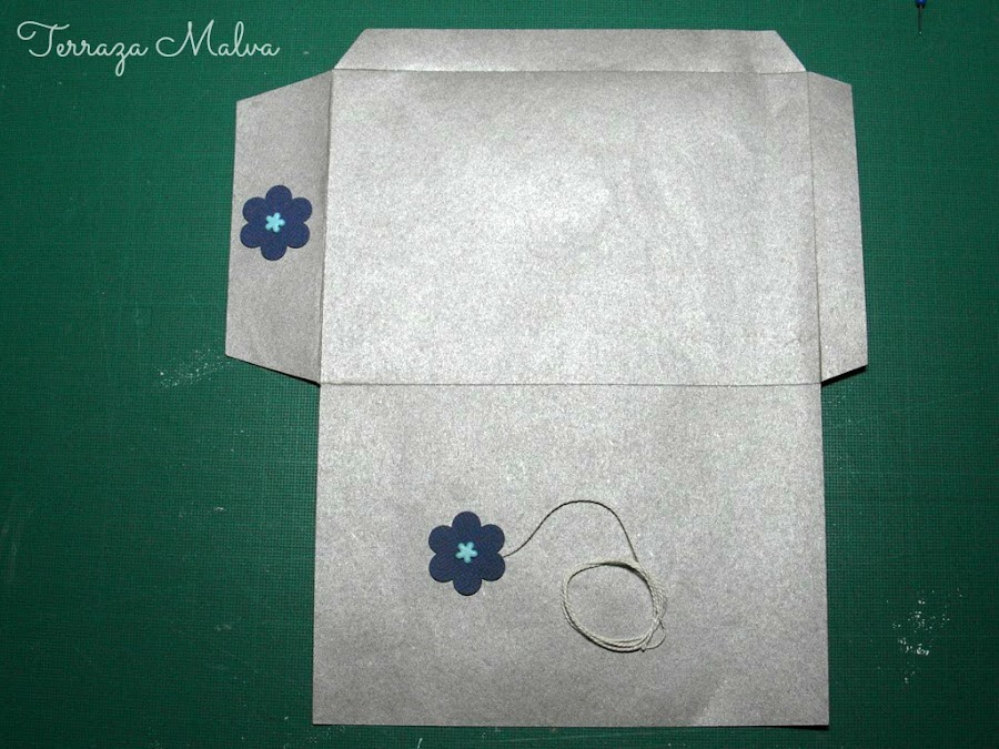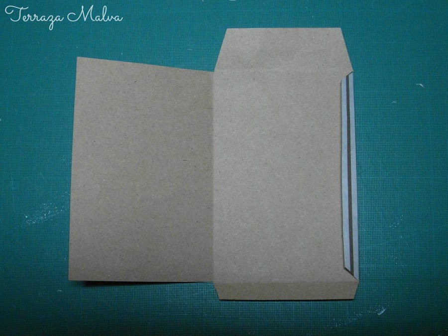 Estas dos piezas de cartulina pueden sujetarse cosiéndolas al sobre justo por su centro o como en mi caso, utilizar unos brads.