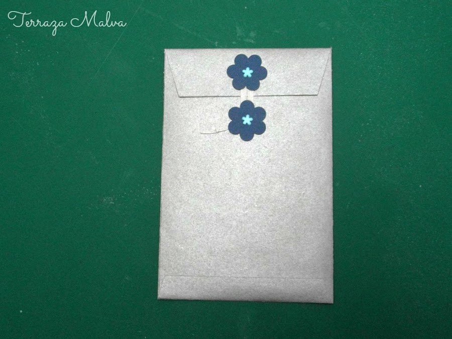 En la foto inferior podéis ver como queda el cierre del sobre, después de enrollar el hilo entre las dos piezas de cartulina. A mí me gusta mucho como ha quedado el sobre tal cual está, pero podéis decorar el exterior con algún sello, dibujo, cintas o cualquier técnica que se os ocurra.