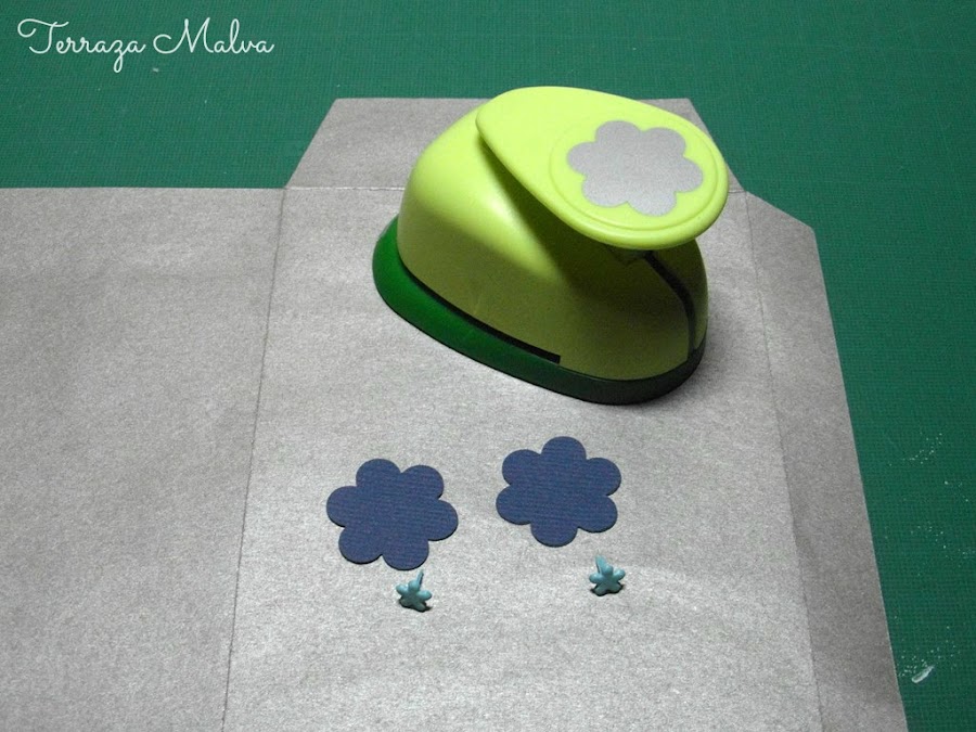 Para hacer unos cierres decorados para el sobre puede utilizarse el círculo de la plantilla y marcarlo sobre un poco de cartulina (o papel grueso). Yo en lugar de los círculos he aprovechado un troquel en forma de flor cuyo tamaño venía perfecto al sobre y he obtenido dos piezas de una cartulina gofrada en color azul que contrasta con el plateado del sobre.