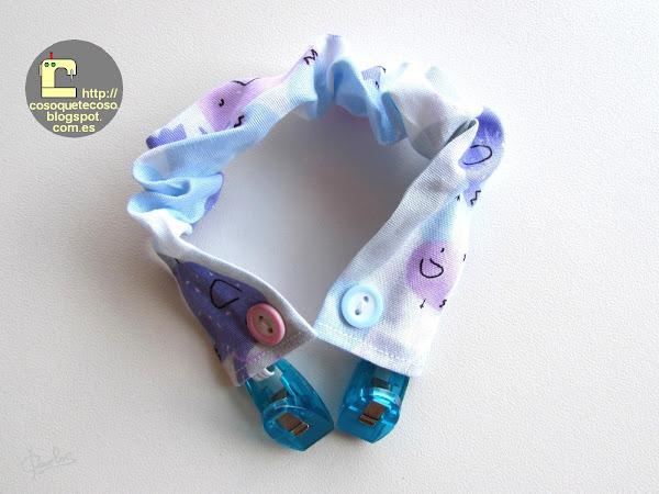 Como os comentaba en mi post de ayer, se trata de un invento para llevar en el bolso y poder convertir cualquier cosa en babero: tu pañuelo favorito, el de tu pareja, el foular de seda tan carísimo, o un simple pañuelo o servilleta de papel.