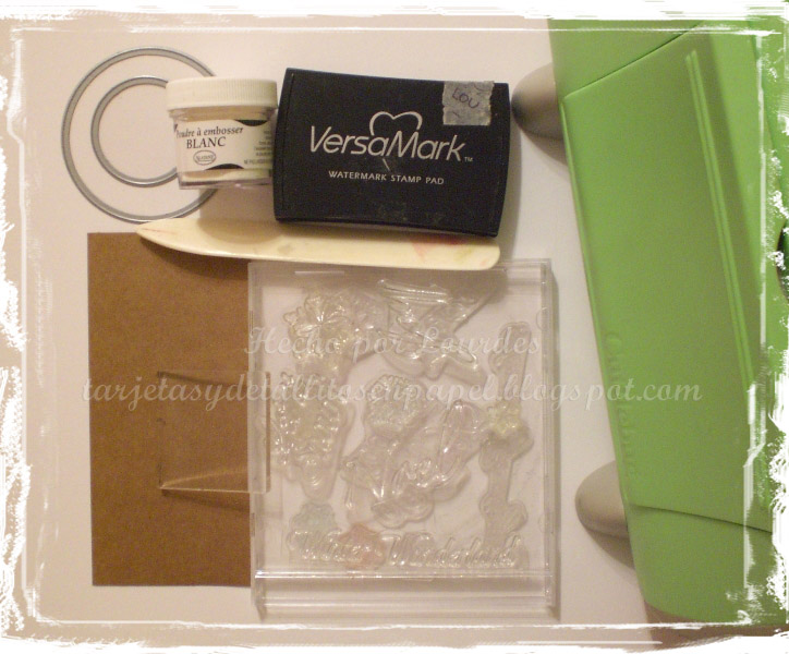 Para comenzar a decorar, he usado un sello con un texto navideño y coloqué tinta Versamark para fijar los polvos
