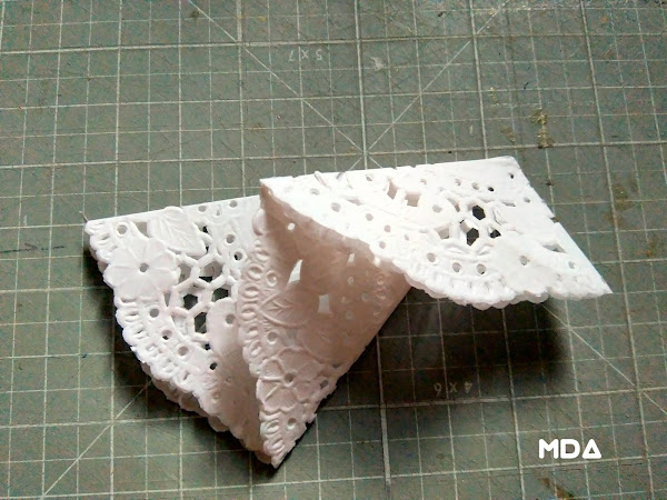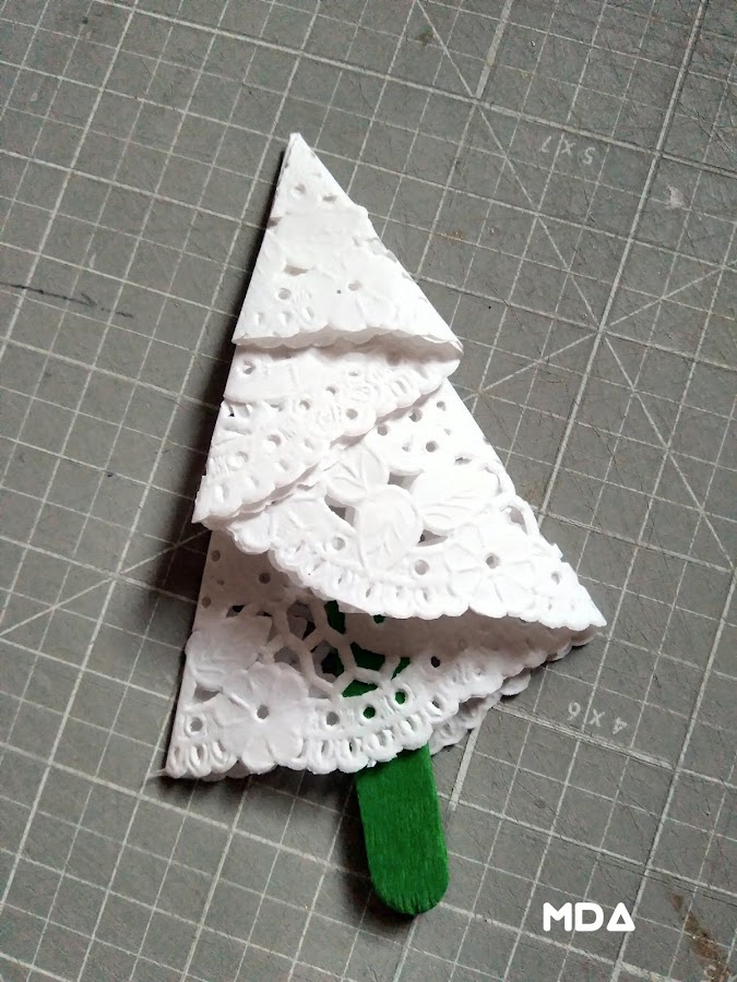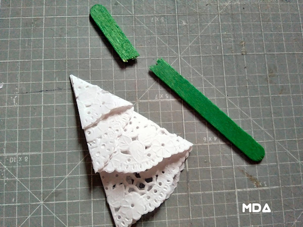 Le ponemos un poco de pegamento a los dobleces para sujetar la blonda y partimos el palo de helado al tamaño que nos venga mejor.