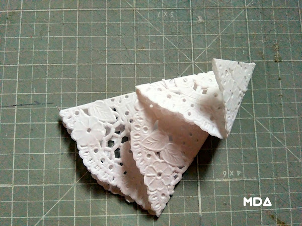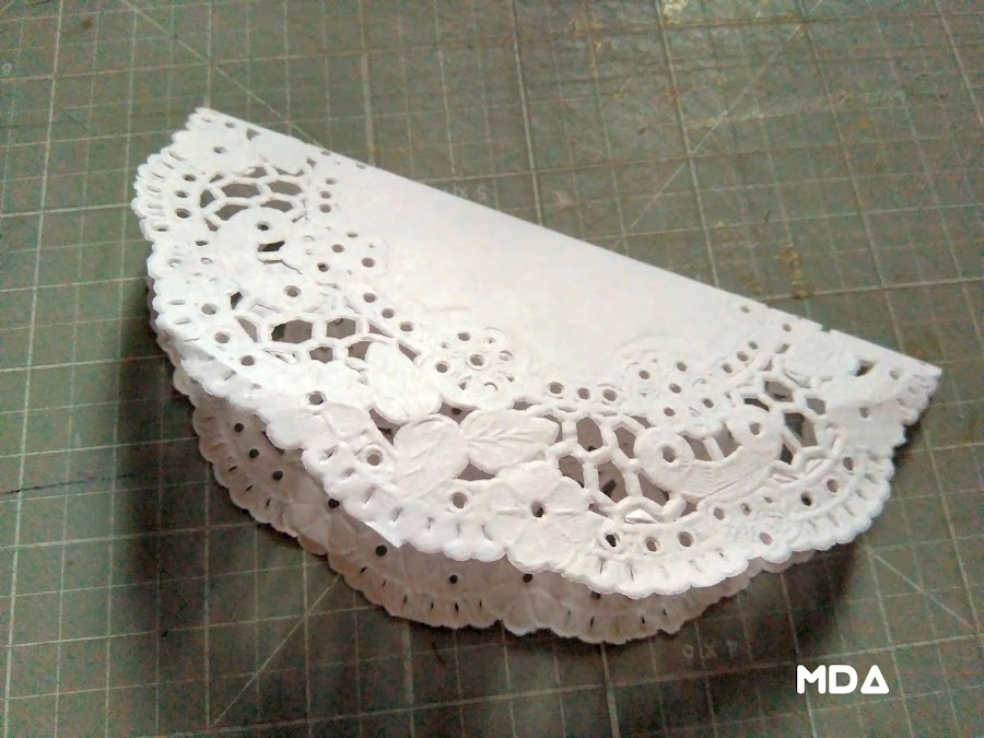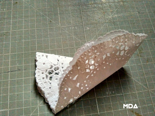 Ponemos un poco de pegameto en el palo de helado y lo colocamos entre la blonda. Y este es el resultado, ahora a decorar!!!!!