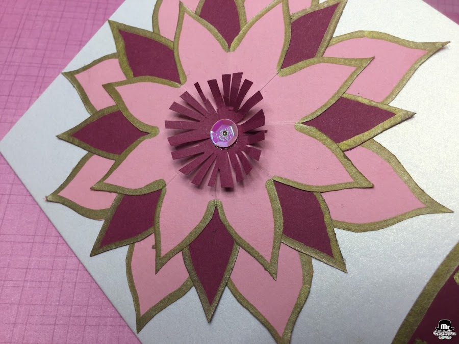 Finalmente hacemos un centro para nuestra flor doblando un papel de 5x5 de la misma manera y haciendo en vez de una hoja, unos estambres. Lo colocamos en el centro y para rematar colocamos una lentejuela.