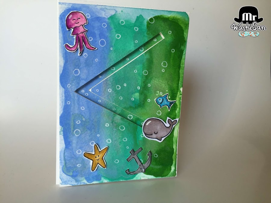 Vamos a ver cómo confeccionar una tarjeta interactiva con movimiento donde una figura con forma de ballena da volteretas yendo y viniendo por la tarjeta. Es una tarjeta muy especial que seguro que sorprenderá y gustará a grandes y pequeños! Además, veremos cómo confeccionar con acuarelas el panel frontal de la tarjeta con diferentes tonos de azul y verde imitando el fondo del mar y aportando un toque de brillo. Vamos al lío.