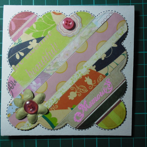 Tercero tenemos que recortar con el scallop la cartulina con las tiras de papel ya pegadas, teniendo especial cuidado de que al recortar el diseño no nos quede ninguna parte de cartulina visible.