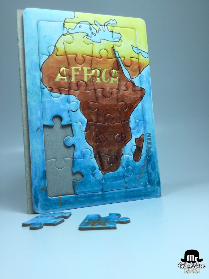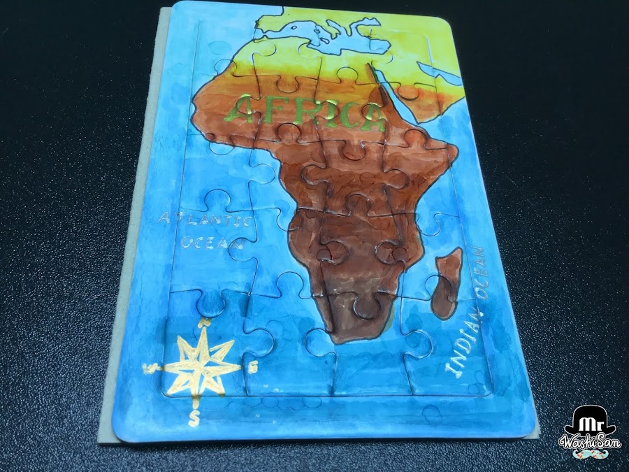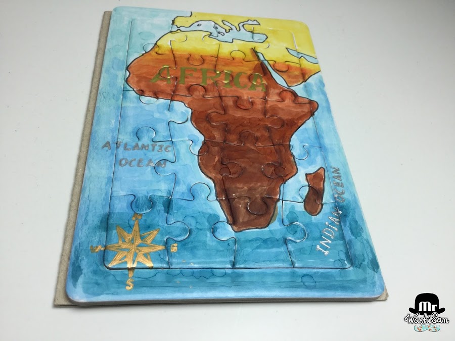 Para confeccionar esta tarjeta utilizaremos un puzzle en blanco, que vamos a dibujar y colorear para crear un dibujo del continente africano, ya que la destinataria de la tarjeta es una niña que se llama África.