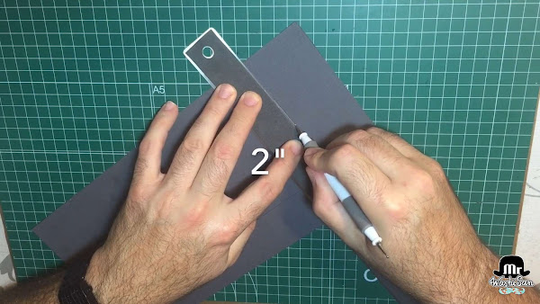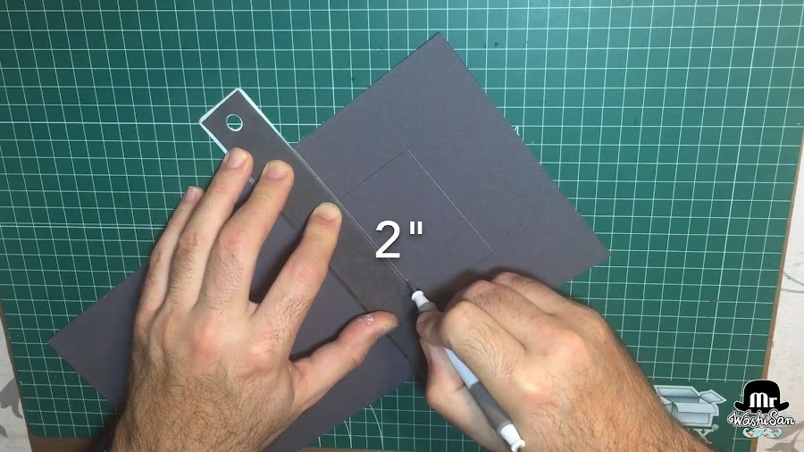 Vamos a realizar dos cortes. El primero va a ir a una pulgada y media respecto al borde superior y va a ir de un punto situado a dos pulgadas de cada uno de los extremos de la cartulina.