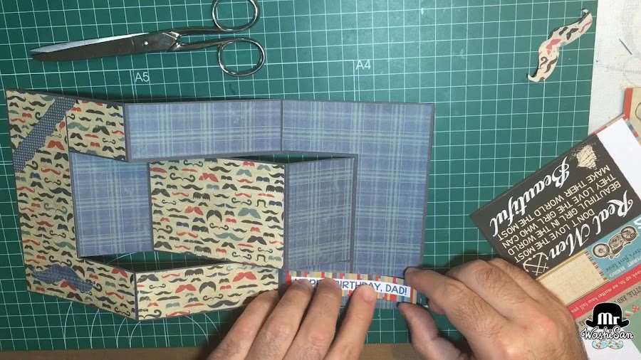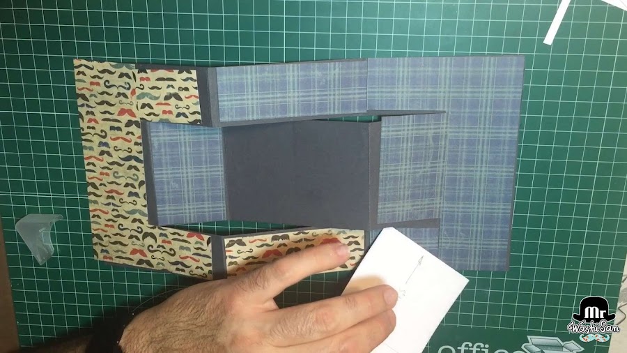 Las colocamos como más nos convenza. Yo en mi caso los he situado de manera que en un lado un papel decorado y por el otro se ve el segundo papel. Cuando estamos satisfechos, pegamos con cinta de doble cara.
