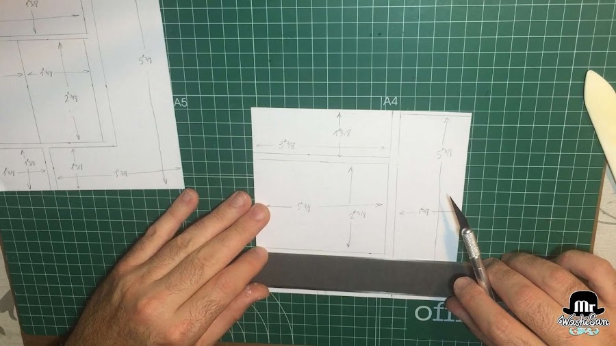 Con una cuchilla y una regla metálica recortamos las formas del papel decorado.