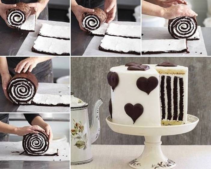 Simplemente necesitaras un bizcocho normal redondo y planchas de bizcocho como de un centímetro de espesor, que puedes hacer en una bandeja de horno. Cuando las tengas córtalas a la misma medida y extiende sobre ellas una crema de relleno. Comienza a enrollarlas como ves en la fotografía, hasta llegar al tamaño del bizcocho redondo, este lo utilizaremos cortándolo por la mitad de base y tapa de nuestro rollo.