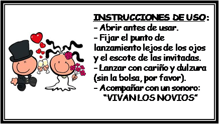 El día de mi boda preparé todas las bolsitas de organza con su puñado de arroz correspondiente (y un puñado de confeti que yo misma preparé), y le puse unas etiquetas muy divertidas, en plan gracioso, con "instrucciones de uso" para los invitados. Esto va a gusto de cada novia, a mí me pareció un paso más en el cuidado de todos los detalles, pero mi hermana por ejemplo decidió prescindir de ellas, y quedaron igualmente bonitas. Si os gustan las etiquetas y os decidís por ellas, sólo tenéis que pedirme la plantilla personalizable.