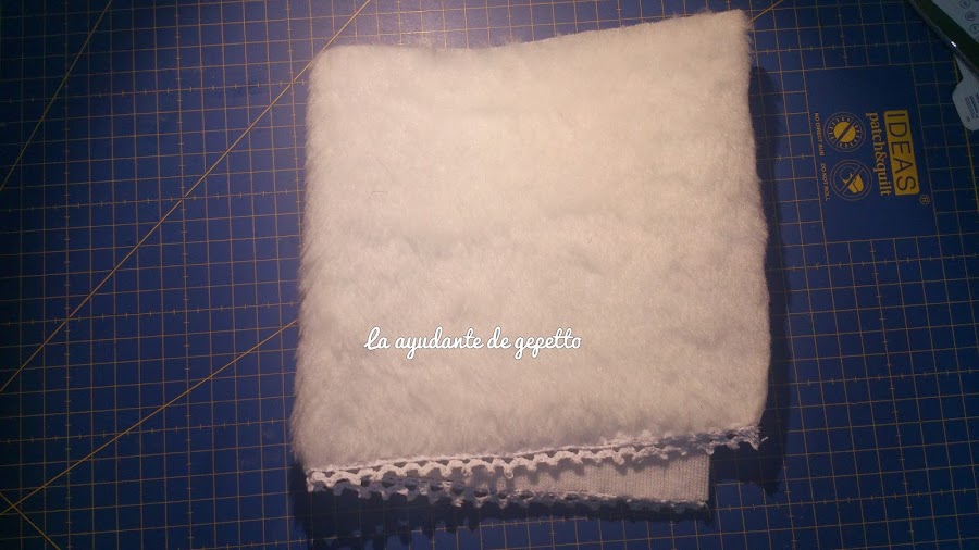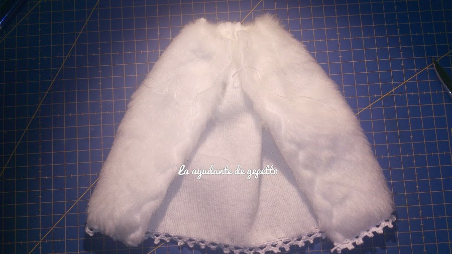 Para la parte de abajo del abrigo corte un rectangulo de 30 x 20 cm en la parte de abajo le puse una pequeña puntilla. y frunci la parte de arriba, dejandola abierta como se muestra en la foto.