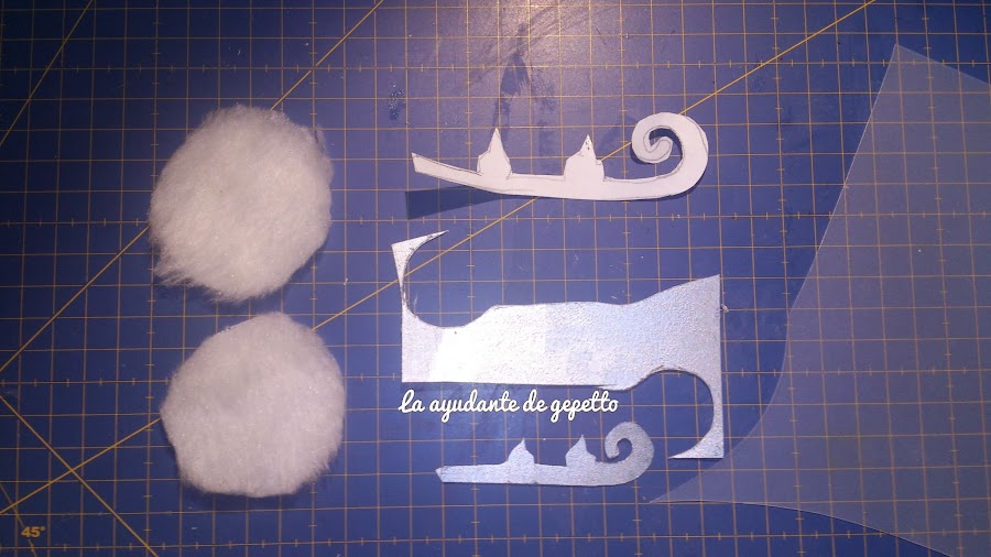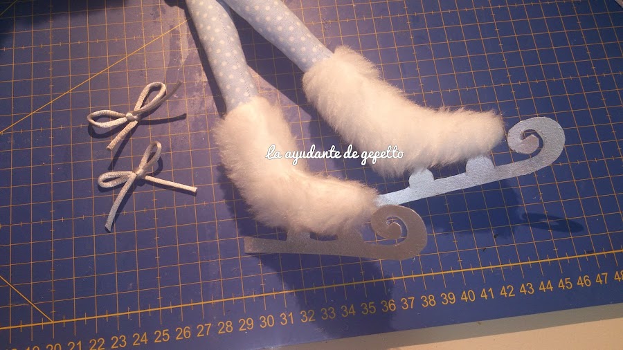 Estas son: las cuchillas de los patines y los círculos para las orejeras. Las cuchillas de los patines las hice con una planchita pequeña de acetato pintada de color plata,luego solo tuve que recortarla y pegarselas a las botas con un poco de pegamento de contacto tipo loctite.(previamente las marque en las botas y les hice un pequeño corte para que entrasen los piquitos que se ven en la foto.)