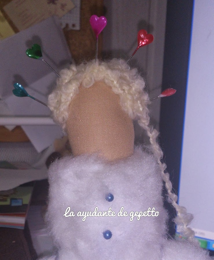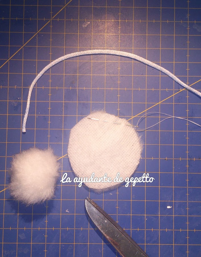 Se cortan dos círculos y se frunce todo alrededor ,rellenamos con un poquito de fibra y cosemos a cada lado un poquito de cuerda o cola de ratón a la medida de la cabecita de nuestra tilda A continuación el pelo.
