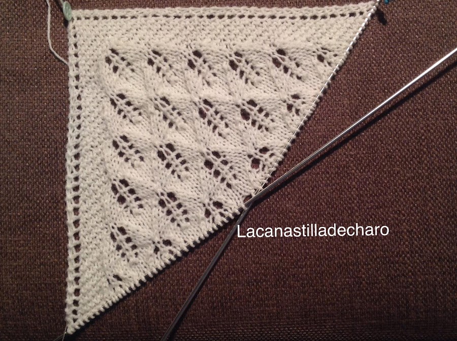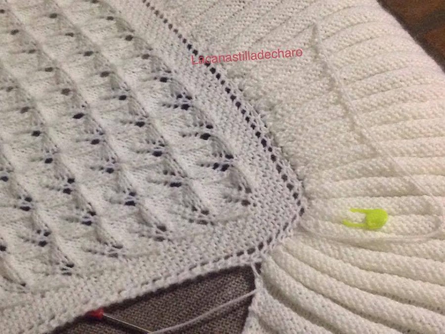 Se empieza con 4 puntos, y todas las pasadas del derecho hasta obtener, 2 puntos, hebra, 15 puntos, hebra, 2 puntos....