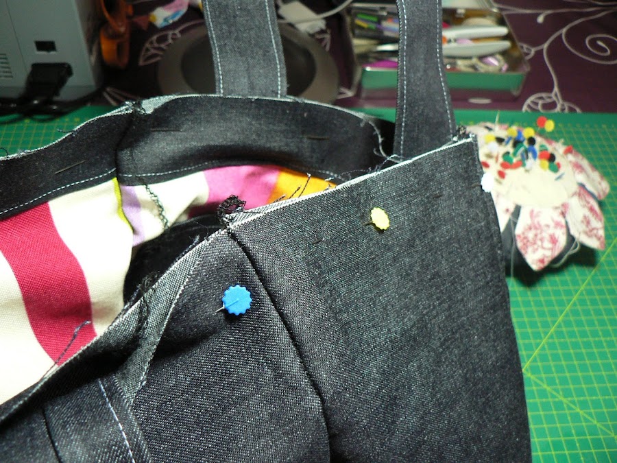 Poco a poco vamos uniendo con alfileres las dos partes encajando las esquinas todo lo que podamos. Doblamos hacia dentro un centímetro de los dos bordes y cosemos por todo el contorno pon un pespunte sencillo o con una puntada decorativa para unir las dos piezas.