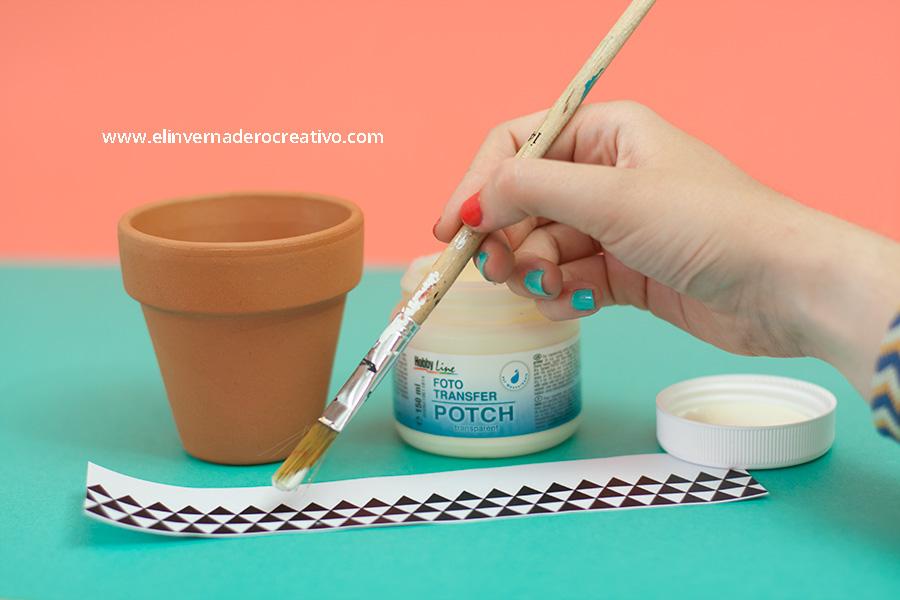 Corta el diseño que hayas elegido y aplícale una capa contundente del Foto Transfer. Lo mejor es aplicar una capa gruesa pero bien estirada para que no queden grupos o burbujas cuando vayamos a pegarlo.